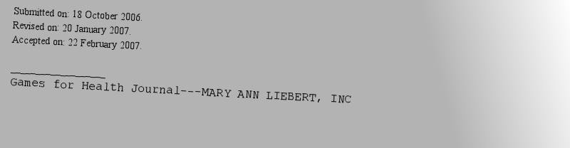 | 期刊全称 | Games for Health Journal | | 期刊简称 | GAMES HEALTH J | | 影响因子2024 | 2.223 | | 视频video | http://file.papertrans.cn/11/10373/10373.mp4 | | ISSN | 2161-783X | | eISSN | 2161-7856 | | 出版商 | MARY ANN LIEBERT, INC | | 发行地址 | 140 HUGUENOT STREET, 3RD FL, NEW ROCHELLE, USA, NY, 10801 | | 学科分类 | 1.Social Sciences Citation Index (SSCI)--Public, Environmental & Occupational Health | Rehabilitation; 2.Current Contents Social And Behavioral Sciences--Public Health & Health Care Science; 3.Essential Science Indicators--Social Sciences, General; | | 出版语言 | English |