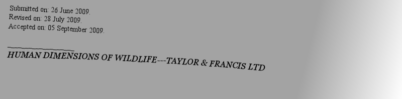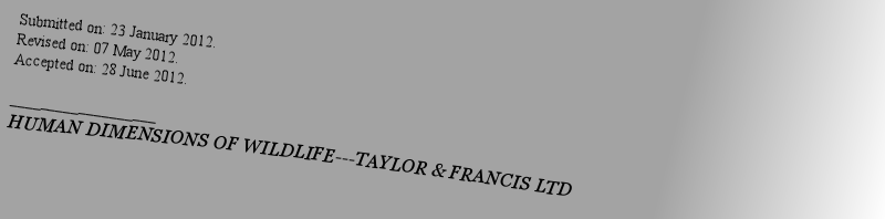| 期刊全称 | HUMAN DIMENSIONS OF WILDLIFE | | 期刊简称 | HUM DIMENS WILDL | | 影响因子2024 | 1.766 | | 视频video | http://file.papertrans.cn/12/11556/11556.mp4 | | ISSN | 1087-1209 | | eISSN | 1533-158X | | 出版商 | TAYLOR & FRANCIS LTD | | 发行地址 | 2-4 PARK SQUARE, MILTON PARK, ABINGDON, England, OXON, OX14 4RN | | 学科分类 | 1.Science Citation Index Expanded (SCIE)--Biodiversity Conservation | Environmental Sciences; 2.Biological Abstracts--Biodiversity Conservation | Environmental Sciences; 3.BIOSIS Previews_BIOSIS Citation Index--Biodiversity Conservation | Environmental Sciences; 4.Current Contents Agriculture, Biology & Environmental Sciences--Environment/Ecology; 5.Essential Science Indicators--Environment/Ecology; 6.Zoological Record--Biodiversity Conservation | Environmental Sciences; | | 出版语言 | English |
