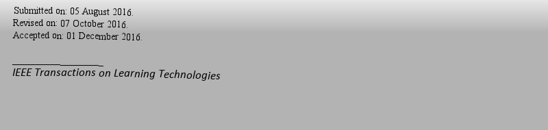 | 期刊全称 | IEEE Transactions on Learning Technologies | | 期刊简称 | IEEE T LEARN TECHNOL | | 影响因子2024 | 2.948 | | 视频video | http://file.papertrans.cn/13/12024/12024.mp4 | | ISSN | 1939-1382 | | eISSN | 1939-1382 | | 出版商 | IEEE COMPUTER SOC | | 发行地址 | 10662 LOS VAQUEROS CIRCLE, PO BOX 3014, LOS ALAMITOS, USA, CA, 90720-1314 | | 学科分类 | 1.Science Citation Index Expanded (SCIE)--Computer Science, Interdisciplinary Applications; 2.Social Sciences Citation Index (SSCI)--Education & Educational Research; 3.Current Contents Engineering, Computing & Technology--Computer Science & Engineering; 4.Current Contents Social And Behavioral Sciences--Education; 5.Essential Science Indicators--Computer Science; | | 出版语言 | English |