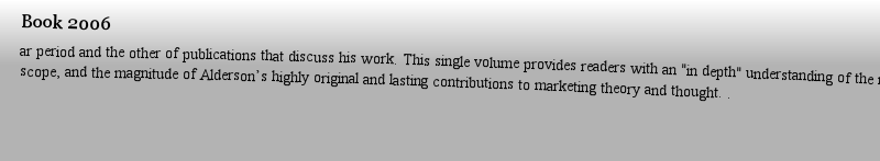 | 期刊全称 | A Twenty-First Century Guide to Aldersonian Marketing Thought | | 影响因子2023 | Ben Wooliscroft,Robert D. Tamilia,Stanley J. Shapi | | 视频video | http://file.papertrans.cn/143/142543/142543.mp4 | | 发行地址 | Will make the published writing of Wroe Alderson, marketing’s most influential 20th century thinker, available to current and subsequent generations of students of marketing, business, and management | | 图书封面 |  | | 影响因子 | .A Twenty-First Century Guide to Aldersonian Marketing Thought. introduces readers to the life, the writings and the intellectual legacy of Wroe Alderson, the preeminent marketing thinker of the mid-twentieth century. Both Alderson’s seminal contributions to marketing theory and his "best practices" articles in the areas of marketing management and ethics have been reproduced. Contributions by others about Wroe Alderson include a biography and a number of previously published articles that build on Alderson‘s theoretical contributions. Six original articles further explore Wroe Alderson‘s life, his work, his character and his intellectual impact. This book also contains two bibliographies: one of material written by Alderson over a forty year period and the other of publications that discuss his work. This single volume provides readers with an "in depth" understanding of the nature, the scope, and the magnitude of Alderson’s highly original and lasting contributions to marketing theory and thought. . | | Pindex | Book 2006 |