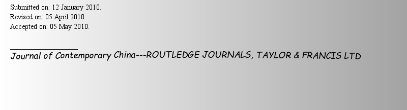 | 期刊全称 | Journal of Contemporary China | | 期刊简称 | J CONTEMP CHINA | | 影响因子2024 | 2.498 | | 视频video | http://file.papertrans.cn/17/16150/16150.mp4 | | ISSN | 1067-0564 | | eISSN | 1469-9400 | | 出版商 | ROUTLEDGE JOURNALS, TAYLOR & FRANCIS LTD | | 发行地址 | 2-4 PARK SQUARE, MILTON PARK, ABINGDON, ENGLAND, OXON, OX14 4RN | | 学科分类 | 1.Social Sciences Citation Index (SSCI)--Area Studies; 2.Current Contents Social And Behavioral Sciences--Sociology & Social Sciences; 3.Essential Science Indicators--Social Sciences, General; | | 出版语言 | English |