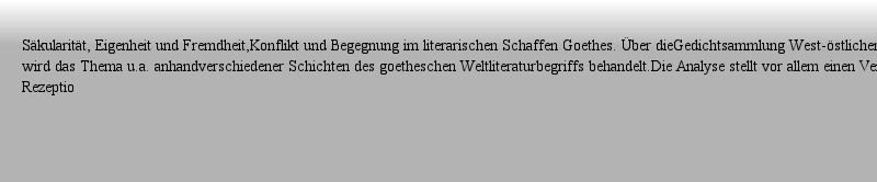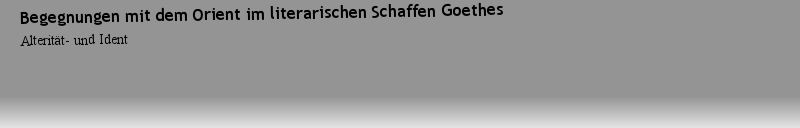 期刊全称 | Begegnungen mit dem Orient im literarischen Schaffen Goethes | 期刊简称 | Alterität- und Ident | 影响因子2023 | Edvin Cami | 视频video | http://file.papertrans.cn/183/182170/182170.mp4 | 发行地址 | eine literaturwissenschaftliche Studie | 图书封面 |  | 影响因子 | In diesem Buch analysiert Edvin Cami Polaritäten wie Ost und West, Islamund Christentum, Religion und Säkularität, Eigenheit und Fremdheit,Konflikt und Begegnung im literarischen Schaffen Goethes. Über dieGedichtsammlung West-östlicher Divan hinaus wird das Thema u.a. anhandverschiedener Schichten des goetheschen Weltliteraturbegriffs behandelt.Die Analyse stellt vor allem einen Versuch zur Rezeption der Thematikin einer aktuellen Diskursivität dar. | Pindex | Book 2019 |