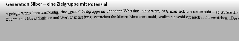 Jessica Lietzau,Holger Rabe,Serge Ennsermögen und besitzt Häuser und Eigentumswohnungen. Rund 80 Prozent aller Bankeinlagen sind auf sie einge tragen. Sie ist gesünder, aktiver, anspruchsvoller und vielschichtiger als jede Generation zuvor. Um diese Lebensqualität so gut wie möglich zu bewahren, ist es in dieser Lebensphase von zentrale