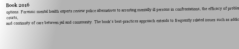 | 期刊全称 | Best Practices for the Mentally Ill in the Criminal Justice System | | 影响因子2023 | Lenore E.A. Walker,James M. Pann,Vincent B. Van Ha | | 视频video | http://file.papertrans.cn/185/184223/184223.mp4 | | 发行地址 | Most of the research found in this book revolves around programs for justice-involved people in the prisons, not the jails and detention centers.Information in this book is an integration of the liter | | 学科分类 | SpringerBriefs in Psychology | | 图书封面 |  | | 影响因子 | .This timely brief resource introduces a new evidence-based model for treatment of mentally ill individuals in jails, with emphasis on community-based options. Forensic mental health experts review police alternatives to arresting mentally ill persons in confrontations, the efficacy of problem-solving courts, and continuity of care between jail and community. The book‘s best-practices approach extends to frequently related issues such as addiction, domestic violence, juvenile considerations, and trauma and describes successful programs coordinating judicial and clinical systems. These guidelines for decriminalizing non-violent behaviors and making appropriate services available to those with mental problems should also help address issues affecting the justice system, such as overcrowding. .Included in the coverage: .The Best Practices Model..Best practices in law enforcement crisis interventions with the mentally ill..Problem-solving courts and therapeutic jurisprudence..Competency restoration programs..A review of best practices for the treatment of persons with mental illness in jail..Conclusions, recommendations, and helpful appendices..With its practical vision for systemic im | | Pindex | Book 2016 |