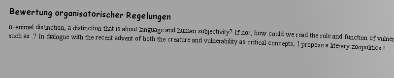 | 期刊全称 | Beyond the Human-Animal Divide | | 期刊简称 | Creaturely Lives in | | 影响因子2023 | Dominik Ohrem,Roman Bartosch | | 视频video | http://file.papertrans.cn/186/185337/185337.mp4 | | 发行地址 | Argues for the importance of the creaturely in navigating the ethical complexities of the Anthropocene.Explores creatural presences across disciplines, including historiography, ethnography, philosoph | | 学科分类 | Palgrave Studies in Animals and Literature | | 图书封面 |  | | 影响因子 | This volume explores the potential of the concept of the creaturely for thinking and writing beyond the idea of a clear-cut human-animal divide, presenting innovative perspectives and narratives for an age which increasingly confronts us with the profound ecological, ethical and political challenges of a multispecies world. The text explores written work such as Samuel Beckett’s .Worstward Ho. and Michel Foucault‘s .The Order of Things, .video media such as the film "Creature Comforts" and the video game .Into the Dead, .and photography. With chapters written by an international group of philosophers, literary and cultural studies scholars, historians and others, the volume brings together established experts and forward-thinking early career scholars to provide an interdisciplinary engagement with ways of thinking and writing the creaturely to establish a postanthropocentric sense of human-animal relationality. . | | Pindex | Book 2017 |