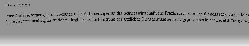 期刊全称 | Beziehungsmanagement im Arzt-Patient-Verhältnis | 期刊简称 | Der Einfluss der Qua | 影响因子2023 | Thomas Keller | 视频video | http://file.papertrans.cn/186/185389/185389.mp4 | 学科分类 | Gabler Edition Wissenschaft | 图书封面 |  | 影响因子 | Die in den letzten Jahren angestoßenen Reformprojekte im Gesundheitswesen zielen auf die Förderung von Qualität und Effizienz in der bundesdeutschen Gesundheitsversorgung ab und verändern die Anforderungen an das betriebswirtschaftliche Praxismanagement niedergelassener Ärzte. Mit der Absicht, eine hohe Patientenbindung zu erreichen, liegt die Herausforderung des ärztlichen Dienstleistungserstellungsprozesses in der Bereitstellung einer qualitativ hochwertigen, den Bedürfnissen der Patienten entsprechenden Versorgungsleistung...Thomas Keller analysiert den Zusammenhang zwischen der Qualität und den Ergebnisgrößen des ärztlichen Dienstleistungsprozesses. Anhand einer empirischen Untersuchung überprüft er den Einfluss der Potential-, Interaktions- und Prozessqualität auf die Ergebnisqualität, Patientenzufriedenheit und -bindung in verschiedenen Patientengruppen.. | Pindex | Book 2002 |