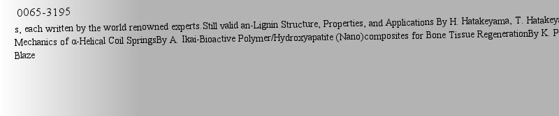 | 期刊全称 | Biopolymers | | 期刊简称 | Lignin, Proteins, Bi | | 影响因子2023 | Akihiro Abe,Karel Dusek,Shiro Kobayashi | | 视频video | http://file.papertrans.cn/189/188405/188405.mp4 | | 发行地址 | Highest Impact Factor of all publications ranked by ISI within Polymer Science.Short and concise reports on physics and chemistry of polymers, each written by the world renowned experts.Still valid an | | 学科分类 | Advances in Polymer Science | | 图书封面 |  | | 影响因子 | -Lignin Structure, Properties, and Applications By H. Hatakeyama, T. Hatakeyama-Tensile Mechanics of α-Helical Coil SpringsBy A. Ikai-Bioactive Polymer/Hydroxyapatite (Nano)composites for Bone Tissue RegenerationBy K. Pielichowska, S. Blazewicz | | Pindex | Book 2010 |