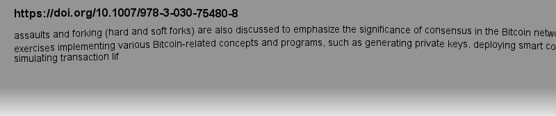 | 期刊全称 | Blockchain Essentials | | 期刊简称 | Core Concepts and Im | | 影响因子2023 | Ramchandra Sharad Mangrulkar,Pallavi Vijay Chavan | | 视频video | http://file.papertrans.cn/190/189188/189188.mp4 | | 发行地址 | Includes use cases to reinforce each concept.Covers blockchain implementation using Python, Solidity, Ganache, and more.Discusses applications and implementations beyond cryptocurrencies | | 图书封面 |  | | 影响因子 | .This book will teach you the core concepts of blockchain technology in a concise manner through straightforward, concrete examples using a range of programming languages, including Python and Solidity. The 50 programs presented in this book are all you need to gain a firm understanding of blockchain and how to implement it...The book begins with an introduction to the fundamentals of blockchain technology, followed by a review of its types, framework, applications and challenges. Moving ahead, you will learn basic blockchain programming with hash functions, authentication code, and Merkle trees. You will then dive into the basics of bitcoin, including wallets, digital keys, transactions, digital signatures, and more. This is followed by a crash course on Ethereum programming, its network, and ecosystem. As you progress through the book, you will also learn about Hyperledger and put your newly-gained knowledge to work through case studies and example applications. ..After reading this book, you will understand blockchain’s underlying concepts and its common implementations. .. ..What You Will Learn..Master theoretical and practical implementations of various blockchain components u | | Pindex | Book 2024 |