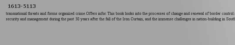 | 期刊全称 | Border Management in Transformation | | 期刊简称 | Transnational Threat | | 影响因子2023 | Johann Wagner | | 视频video | http://file.papertrans.cn/190/189814/189814.mp4 | | 发行地址 | Includes comparative treatises related to definitions of what is organized crime.Provides comparative treatises and correlations related to transnational threats and forms organized crime.Offers infor | | 学科分类 | Advanced Sciences and Technologies for Security Applications | | 图书封面 |  | | 影响因子 | .This book looks into the processes of change and renewal of border control and border security and management during the past 30 years after the fall of the Iron Curtain, and the immense challenges in nation-building in South-Eastern Europe after the collapse of former Yugoslavia in relation to strategic security management. The abolition of border controls within the Schengen area and simultaneous introduction of necessary replacement measures was an additional topic..The book provides an insight into which the European Union is competent in the reform and modernisation of state law enforcement agencies for ensuring effective border control, border surveillance and border management in line with the EU acquis communautaire and EU standards.. .In the 21.st. century, along with the process of globalisation, a constantly evolving security environment creates new dimensions of threats and challenges to security and stability of transnational nature. This seeks for comprehensive, multidimensional, collective and well-coordinated responses..The European Union, Organization for Security and Co-operation in Europe, United Nations, as well as other international organisations are able to | | Pindex | Book 2021 |