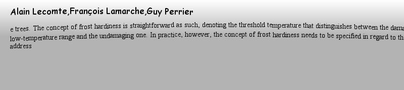 David A. Burke,Kristofer Johannissond grasses, trees overwinter without a sheltering snow cover, so that they are exposed to all the harsh climatic conditions. That is why their climatic adaptation is based on their annual cycle of development, whereby the frost-hardy dormant phase and the susceptible growth phase are synchronised wit