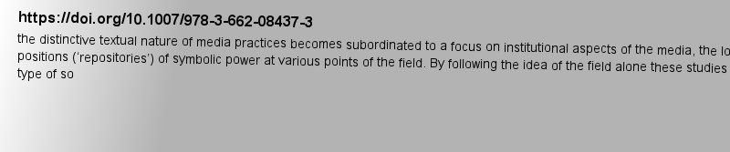 | 期刊全称 | Bourdieu, Language and the Media | | 影响因子2023 | John F. Myles | | 视频video | http://file.papertrans.cn/191/190084/190084.mp4 | | 图书封面 |  | | 影响因子 | This book engages with key theoretical and analytical issues in the field of media, communication and cultural studies. Using case studies of radio, internet, text messaging and photojournalism, it deploys Bourdieu‘s ideas to reveal how language in the media is implicated in broader social patterns of ‘symbolic violence‘. | | Pindex | Book 2010 |