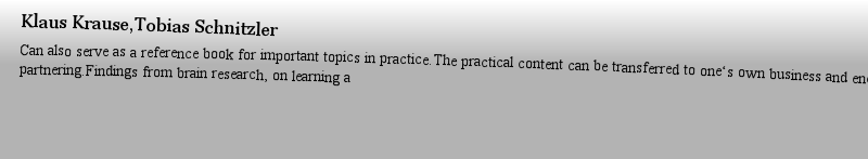 | 期刊全称 | Business Partner Management | | 期刊简称 | Successfully Managin | | 影响因子2023 | Klaus Krause,Tobias Schnitzler | | 视频video | http://file.papertrans.cn/193/192295/192295.mp4 | | 发行地址 | Can also serve as a reference book for important topics in practice.The practical content can be transferred to one‘s own business and encourages partnering.Findings from brain research, on learning a | | 图书封面 |  | | 影响因子 | .This professional book provides a structured, industry-independent and at the same time practical insight into all types of business partnerships. Both relationships with external business partners and internal partnerships with colleagues and employees are considered in depth. The authors guide you through all phases of these partnerships, highlighting the different aspects and offering proven methods and practical tips for working successfully with partners. The focus is on people as partner and individual with interests and goals. The comparison to private partnerships is quite intentional and illustrates the explanations. Findings from brain research, learning and cooperation are also included. . | | Pindex | Book 2022 |