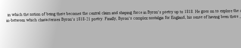 Book 2003the notion of being there becomes the central claim and shaping force in Byron‘s poetry up to 1818. He goes on to explore the concept of being in-between which characterises Byron‘s 1818-21 poetry. Finally, Byron‘s complex nostalgia for England, his sense of having been there , is read in relation t
