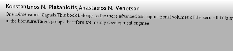 概述 | One-Dimensional Signals.This book belongs to the more advanced and applicational volumes of the series.It fills an existing gap in the literature.Target groups therefore are mainly development enginee |