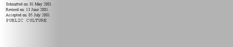 Submitted on: 01 September 2000. Revised on: 20 September 2000. Accepted on: 01 October 2000. PUBLIC CULTURE---DUKE UNIV PRESS