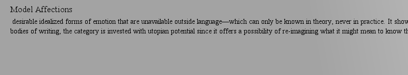| 书目名称 | Eighteenth-Century Literary Affections | | 编辑 | Louise Joy | | 视频video | http://file.papertrans.cn/304/303237/303237.mp4 | | 概述 | Helps to define the affective vocabulary of the eighteenth-century.Brings marginalized works, especially by women writers, alongside canonical texts.Suggests a line of continuity between eighteenth-ce | | 丛书名称 | Palgrave Studies in Affect Theory and Literary Criticism | | 图书封面 |  | | 描述 | .This book assesses the mediating role played by ‘affections‘ in eighteenth-century contestations about reason and passion, questioning their availability and desirability outside textual form. It examines the formulation and idealization of this affective category in works by Isaac Watts, Lord Shaftesbury, Mary Hays, William Godwin, Helen Maria Williams, and William Wordsworth. Part I outlines how affections are invested with utopian potential in theology, moral philosophy, and criticism, re-imagining what it might mean to know emotion. Part II considers attempts of writers at the end of the period to draw affections into literature as a means of negotiating a middle way between realism and idealism, expressivism and didacticism, particularity and abstraction, subjectivity and objectivity, femininity and masculinity, radicalism and conservatism, and the foreign and the domestic. . | | 出版日期 | Book 2020 | | 关键词 | affect; history of emotions; William Wordsworth; affections; femininity; realism; passion; emotion; romantic | | 版次 | 1 | | doi | https://doi.org/10.1007/978-3-030-46008-2 | | isbn_softcover | 978-3-030-46010-5 | | isbn_ebook | 978-3-030-46008-2Series ISSN 2634-6311 Series E-ISSN 2634-632X | | issn_series | 2634-6311 | | copyright | The Editor(s) (if applicable) and The Author(s) 2020 |