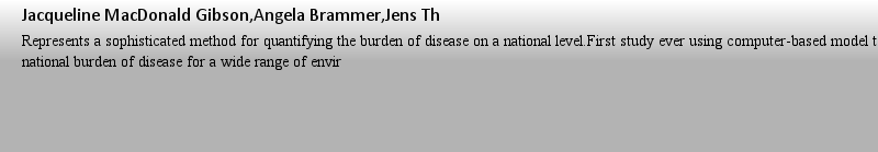 | 概述 | Represents a sophisticated method for quantifying the burden of disease on a national level.First study ever using computer-based model to estimate national burden of disease for a wide range of envir |