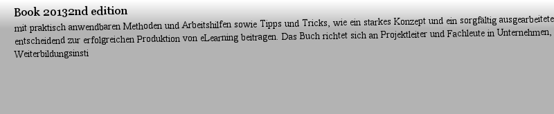 | 书目名称 | eLearning - Konzept und Drehbuch | | 副标题 | Handbuch für Mediena | | 编辑 | Daniela Stoecker | | 视频video | http://file.papertrans.cn/321/320831/320831.mp4 | | 概述 | Die Entstehung eines Drehbuchs für eLearning Schritt für Schritt erläutert.Vermittelt Kernkompetenzen für Drehbuchautoren, Arbeitsorganisation und -abläufe.Durchgehend überarbeitet und aktualisiert.In | | 丛书名称 | X.media.press | | 图书封面 |  | | 描述 | .eLearning – Konzept und Drehbuch .ist ein Praxishandbuch, das Medienautoren und Projektleitern Einblick gewährt in die komplexe Vorarbeit für die Realisierung von eLearning-Projekten. Vor diesem Hintergrund beschreibt das Buch, wie Projektleiter und Medienautor in Teamarbeit ein Drehbuch für eLearning erstellen, das lernpsychologischen Kriterien und der aktuellen Multimedia-Didaktik gerecht wird. Werkzeuge für das Konzipieren und Schreiben von Drehbüchern werden vorgestellt und evaluiert, sodass eine bedarfsgerechte Auswahl möglich wird. Das Handbuch ist angereichert mit Tipps für die Arbeitsorganisation und einem Abriss über das Berufsbild des Medienautors. Im Anhang und online stehen zahlreiche Checklisten bereit, z.B. zur Prüfung eines fertigen Drehbuchs: eine Qualitätssicherungsmaßnahme, die Zeit und Kosten sparen hilft. Das direkt für den beruflichen Alltag geschriebene Buch zeigt mit praktisch anwendbaren Methoden und Arbeitshilfen sowie Tipps und Tricks, wie ein starkes Konzept und ein sorgfältig ausgearbeitetes Drehbuch entscheidend zur erfolgreichen Produktion von eLearning beitragen. Das Buch richtet sich an Projektleiter und Fachleute in Unternehmen, Weiterbildungsinsti | | 出版日期 | Book 20132nd edition | | 关键词 | Didaktik; Drehbuch; E-Learning; Medienautor; Mediendidaktik; Multimedia-Autor; Mutlimedia; eLearning | | 版次 | 2 | | doi | https://doi.org/10.1007/978-3-642-17206-9 | | isbn_ebook | 978-3-642-17206-9Series ISSN 1439-3107 Series E-ISSN 2523-3998 | | issn_series | 1439-3107 | | copyright | Springer-Verlag Berlin Heidelberg 2013 |