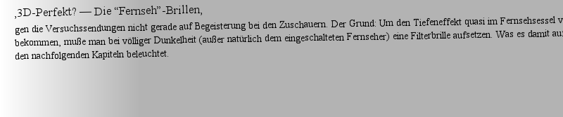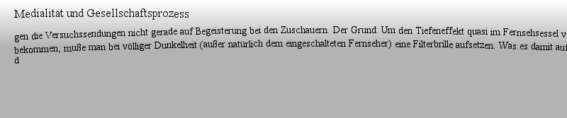 ,3D-Perfekt? — Die “Fernseh”-Brillen,gen die Versuchssendungen nicht gerade auf Begeisterung bei den Zuschauern. Der Grund: Um den Tiefeneffekt quasi im Fernsehsessel vermittelt zu bekommen, muße man bei völliger Dunkelheit (außer natürlich dem eingeschalteten Fernseher) eine Filterbrille aufsetzen. Was es damit auf sich hat, wird in d