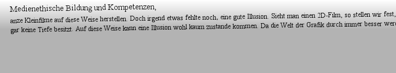 Warum eine dritte Dimension?,anze Kleinfilme auf diese Weise herstellen. Doch irgend etwas fehlte noch, eine gute Illusion. Sieht man einen 2D-Film, so stellen wir fest, daß dieser rein gar keine Tiefe besitzt. Auf diese Weise kann eine Illusion wohl kaum zustande kommen. Da die Welt der Grafik durch immer besser werdende Hardw