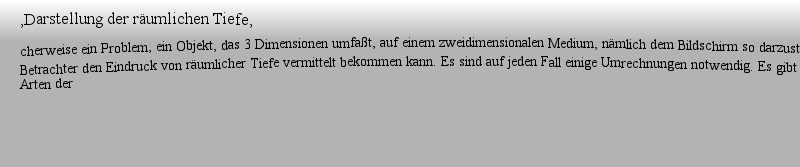 https://doi.org/10.1007/978-3-476-02929-4cherweise ein Problem, ein Objekt, das 3 Dimensionen umfaßt, auf einem zweidimensionalen Medium, nämlich dem Bildschirm so darzustellen, daß der Betrachter den Eindruck von räumlicher Tiefe vermittelt bekommen kann. Es sind auf jeden Fall einige Umrechnungen notwendig. Es gibt verschiedene Arten der