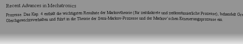 Markov-Theorie,Prozesse. Das Kap. 4 enthält die wichtigsten Resultate der Markovtheorie (für zeitdiskrete und zeitkontinuierliche Prozesse), behandelt Grenz- und Gleichgewichtsverhalten und führt in die Theorie der Semi-Markov-Prozesse und der Markov’schen Erneuerungsprozesse ein.