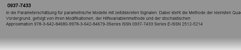 Textbook 1992Latest editionameterschätzung für parametrische Modelle mit zeitdiskreten Signalen. Dabei steht die Methode der kleinsten Quadrate im Vordergrund, gefolgt von ihren Modifikationen, der Hilfsvariablenmethode und der stochastischen Approximation.