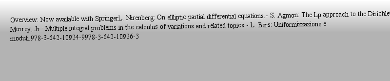 | 描述 | L. Nirenberg: On ellliptic partial differential equations.- S. Agmon: The Lp approach to the Dirichlet problems.- C.B. Morrey, Jr.: Multiple integral problems in the calculus of variations and related topics.- L. Bers: Uniformizzazione e moduli. |
