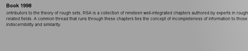 | 描述 | In 1982, Professor Pawlak published his seminal paper on what he called "rough sets" - a work which opened a new direction in the development of theories of incomplete information. Today, a decade and a half later, the theory of rough sets has evolved into a far-reaching methodology for dealing with a wide variety of issues centering on incompleteness and imprecision of information - issues which playa key role in the conception and design of intelligent information systems. "Incomplete Information: Rough Set Analysis" - or RSA for short - presents an up-to-date and highly authoritative account of the current status of the basic theory, its many extensions and wide-ranging applications. Edited by Professor Ewa Orlowska, one of the leading contributors to the theory of rough sets, RSA is a collection of nineteen well-integrated chapters authored by experts in rough set theory and related fields. A common thread that runs through these chapters ties the concept of incompleteness of information to those of indiscernibility and similarity. |