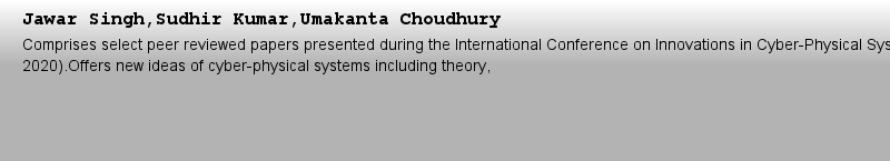 | 书目名称 | Innovations in Cyber Physical Systems | | 副标题 | Select Proceedings o | | 编辑 | Jawar Singh,Sudhir Kumar,Umakanta Choudhury | | 视频video | http://file.papertrans.cn/468/467072/467072.mp4 | | 概述 | Comprises select peer reviewed papers presented during the International Conference on Innovations in Cyber-Physical Systems (ICICPS 2020).Offers new ideas of cyber-physical systems including theory, | | 丛书名称 | Lecture Notes in Electrical Engineering | | 图书封面 |  | | 描述 | .The book presents a collection of peer-reviewed articles from the International Conference on Innovations in Cyber Physical Systems. .(ICICPS 2020). The conference provided opportunities for the presentation of new research results and discussion about them. It was also an opportunity to generation of new ideas in all CPS aspects, including theory, tools, applications, systems, test-beds and field deployments. The range of topics explored is wide, and covers security, control, optimization, machine learning, game theory, mechanism design, mobile and cloud computing, model-based design, verification, data mining/analytics, signal processing, and human-in-the-loop shared or supervisory control. This book will be useful to researchers, students, industrialist, developers, and practitioners alike.. | | 出版日期 | Conference proceedings 2021 | | 关键词 | Internet of Things (IoT); Smart Grid; Block Chain; Automatic manufacturing; Smart Mobility; Cyber Physica | | 版次 | 1 | | doi | https://doi.org/10.1007/978-981-16-4149-7 | | isbn_softcover | 978-981-16-4151-0 | | isbn_ebook | 978-981-16-4149-7Series ISSN 1876-1100 Series E-ISSN 1876-1119 | | issn_series | 1876-1100 | | copyright | The Editor(s) (if applicable) and The Author(s), under exclusive license to Springer Nature Singapor |