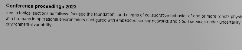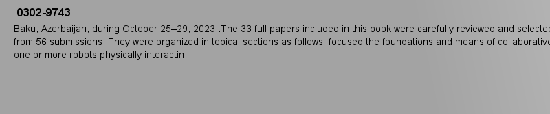 | 描述 | This book constitutes the refereed proceedings of the 8th International Conference on Interactive Collaborative Robotics, ICR 2023, held in Baku, Azerbaijan, during October 25–29, 2023..The 33 full papers included in this book were carefully reviewed and selected from 56 submissions. They were organized in topical sections as follows: focused the foundations and means of collaborative behavior of one or more robots physically interacting with hu-mans in operational environments configured with embedded sensor networks and cloud services under uncertainty and environmental variability.. |