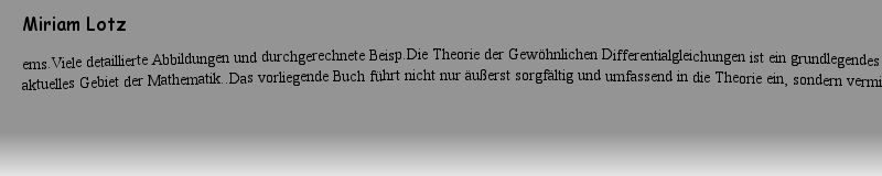 Miriam Lotzems.Viele detaillierte Abbildungen und durchgerechnete Beisp.Die Theorie der Gewöhnlichen Differentialgleichungen ist ein grundlegendes und unverändert aktuelles Gebiet der Mathematik..Das vorliegende Buch führt nicht nur äußerst sorgfältig und umfassend in die Theorie ein, sondern vermittelt auch a