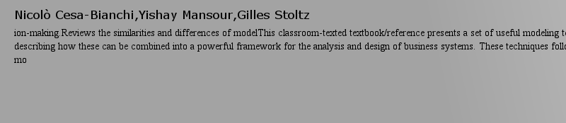 | 书目名称 | Learning Theory | | 副标题 | 18th Annual Conferen | | 编辑 | Peter Auer,Ron Meir | | 视频video | http://file.papertrans.cn/583/582822/582822.mp4 | | 丛书名称 | Lecture Notes in Computer Science | | 图书封面 |  | | 描述 | This volume contains papers presented at the Eighteenth Annual Conference on Learning Theory (previously known as the Conference on Computational Learning Theory) held in Bertinoro, Italy from June 27 to 30, 2005. The technical program contained 45 papers selected from 120 submissions, 3 open problems selected from among 5 contributed, and 2 invited lectures. The invited lectures were given by Sergiu Hart on “Uncoupled Dynamics and Nash Equilibrium”, and by Satinder Singh on “Rethinking State, Action, and Reward in Reinforcement Learning”. These papers were not included in this volume. The Mark Fulk Award is presented annually for the best paper co-authored by a student. The student selected this year was Hadi Salmasian for the paper titled “The Spectral Method for General Mixture Models” co-authored with Ravindran Kannan and Santosh Vempala. The number of papers submitted to COLT this year was exceptionally high. In addition to the classical COLT topics, we found an increase in the number of submissions related to novel classi?cation scenarios such as ranking. This - crease re?ects a healthy shift towards more structured classi?cation problems, which are becoming increasingly rele | | 出版日期 | Conference proceedings 2005 | | 关键词 | Boosting; Support Vector Machine; classification; game theory; learning; learning theory; supervised learn | | 版次 | 1 | | doi | https://doi.org/10.1007/b137542 | | isbn_softcover | 978-3-540-26556-6 | | isbn_ebook | 978-3-540-31892-7Series ISSN 0302-9743 Series E-ISSN 1611-3349 | | issn_series | 0302-9743 | | copyright | Springer-Verlag Berlin Heidelberg 2005 |