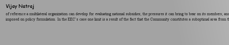 Arthur G. Nikoghosianof reference a multilateral organization can develop for evaluating national subsidies; the pressures it can bring to bear on its members; and the limits imposed on policy formulation. In the EEC’s case one limit is a result of the fact that the Community constitutes a suboptimal area from the persp