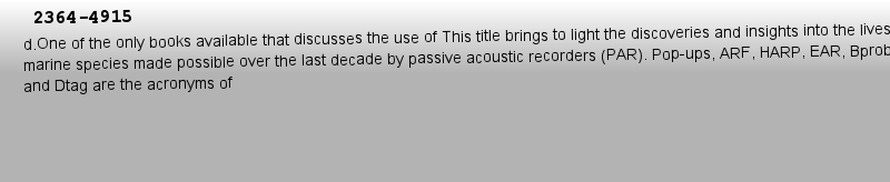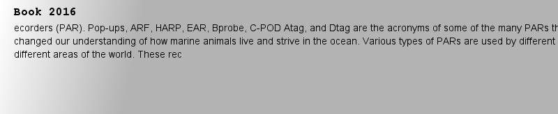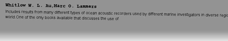 书目名称 | Listening in the Ocean | 编辑 | Whitlow W. L. Au,Marc O. Lammers | 视频video | http://file.papertrans.cn/588/587024/587024.mp4 | 概述 | Includes results from many different types of ocean acoustic recorders used by different marine investigators in diverse regions of the world.One of the only books available that discusses the use of | 丛书名称 | Modern Acoustics and Signal Processing | 图书封面 |  | 描述 | This title brings to light the discoveries and insights into the lives of many marine species made possible over the last decade by passive acoustic recorders (PAR). Pop-ups, ARF, HARP, EAR, Bprobe, C-POD Atag, and Dtag are the acronyms of some of the many PARs that have changed our understanding of how marine animals live and strive in the ocean. Various types of PARs are used by different investigators in different areas of the world. These recorders have accumulated copious amounts of very important data, unveiling previously unknown information about large marine animals. Temporal, seasonal and spatial distribution patterns have been uncovered for many marine species. There have been many discoveries, new understandings and insights into how these animals live in and utilize the ocean and the importance of acoustics in their lives. Listening Within the Ocean summarizes these important discoveries, providing both a valuable resource for researchers and enjoyable reading for non-professionals interested in marine life. | 出版日期 | Book 2016 | 关键词 | Acoustic Detection of Marine Mammals; Acoustic Tracking of Marine Mammals; Marine Bioacoustics; Marine | 版次 | 1 | doi | https://doi.org/10.1007/978-1-4939-3176-7 | isbn_softcover | 978-1-4939-7994-3 | isbn_ebook | 978-1-4939-3176-7Series ISSN 2364-4915 Series E-ISSN 2364-4923 | issn_series | 2364-4915 | copyright | Springer Science+Business Media, LLC, part of Springer Nature 2016 |