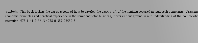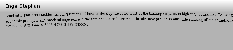 Inge Stephan contexts. This book tackles the big questions of how to develop the basic craft of the thinking required in high-tech companies. Drawing from basic economic principles and practical experience in the semiconductor business, it breaks new ground in our understanding of the complexities of high-tech execution..978-1-4419-3613-4978-0-387-23552-3