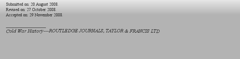 | 期刊全称 | Cold War History | | 期刊简称 | COLD WAR HIST | | 影响因子2024 | 0.404 | | 视频video | http://file.papertrans.cn/6/5874/5874.mp4 | | ISSN | 1468-2745 | | eISSN | 1743-7962 | | 出版商 | ROUTLEDGE JOURNALS, TAYLOR & FRANCIS LTD | | 发行地址 | 2-4 PARK SQUARE, MILTON PARK, ABINGDON, ENGLAND, OXON, OX14 4RN | | 学科分类 | 1.Social Sciences Citation Index (SSCI)--History; 2.Arts & Humanities Citation Index (AHCI)--History; 3.Current Contents Arts & Humanities--History; 4.Current Contents Social And Behavioral Sciences--Sociology & Social Sciences; 5.Essential Science Indicators--Social Sciences, General; | | 出版语言 | English |