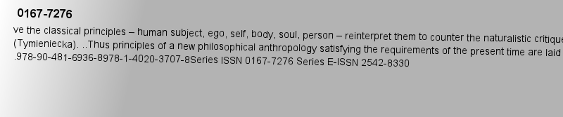 | 书目名称 | Logos of Phenomenology and Phenomenology of The Logos. Book Two | | 副标题 | The Human Condition | | 编辑 | Anna-Teresa Tymieniecka | | 视频video | http://file.papertrans.cn/589/588404/588404.mp4 | | 概述 | The individual is seen in its emergence and unfolding within the dynamic networks of the logos of life, and.within the evolution of living types | | 丛书名称 | Analecta Husserliana | | 图书封面 |  | | 描述 | .The human being is today at the center of scientific, social, ethical and philosophical debates. ..The Human Condition-in-the-unity-of-everything-there-is-alive., under whose aegis the present selection of essays falls, offers the urgently needed new approach to reinvestigating humanness. While recent advances in the neurosciences, genetics and bio-engineering challenge the traditional abstract conception of "human nature", indicating its transformability, thus putting in question the main tenets of traditional philosophical anthropology, in the new perspective of the .Human Creative Condition. the human individual is seen in its emergence and unfolding within the dynamic networks of the .logos of life., and within the evolution of living types. Just the same, the .creative logos .of the mind lifts the human person into a sphere of freedom. Within the networks of the logos we retrieve the classical principles – human subject, ego, self, body, soul, person – reinterpret them to counter the naturalistic critique (Tymieniecka). ..Thus principles of a new philosophical anthropology satisfying the requirements of the present time are laid down. . | | 出版日期 | Book 2006 | | 关键词 | Edmund Husserl; Emmanuel Lévinas; Jan Patocka; Martin Heidegger; Maurice Merleau-Ponty; body; concept; evol | | 版次 | 1 | | doi | https://doi.org/10.1007/1-4020-3707-4 | | isbn_softcover | 978-90-481-6936-8 | | isbn_ebook | 978-1-4020-3707-8Series ISSN 0167-7276 Series E-ISSN 2542-8330 | | issn_series | 0167-7276 | | copyright | Springer Science+Business Media B.V. 2006 |