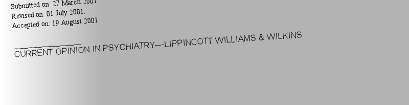| 期刊全称 | CURRENT OPINION IN PSYCHIATRY | | 期刊简称 | CURR OPIN PSYCHIATR | | 影响因子2024 | 7.559 | | 视频video | http://file.papertrans.cn/8/7009/7009.mp4 | | ISSN | 0951-7367 | | eISSN | 1473-6578 | | 出版商 | LIPPINCOTT WILLIAMS & WILKINS | | 发行地址 | TWO COMMERCE SQ, 2001 MARKET ST, PHILADELPHIA, USA, PA, 19103 | | 学科分类 | 1.Science Citation Index Expanded (SCIE)--Psychiatry; 2.Social Sciences Citation Index (SSCI)--Psychiatry; 3.Current Contents Clinical Medicine--Clinical Psychology & Psychiatry; 4.Current Contents Social And Behavioral Sciences--Psychiatry; 5.Essential Science Indicators--Psychiatry/Psychology; | | 出版语言 | English |