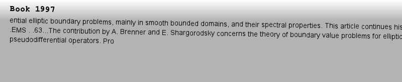 | 描述 | This .EMS. volume gives an overview of the modern theory of elliptic boundary value problems. The contribution by M.S. Agranovich is devoted to differential elliptic boundary problems, mainly in smooth bounded domains, and their spectral properties. This article continues his contribution to .EMS . .63...The contribution by A. Brenner and E. Shargorodsky concerns the theory of boundary value problems for elliptic pseudodifferential operators. Problems both with and without the transmission property, as well as parameter-dependent problems are considered. .The article by B. Plamenevskij deals with general differential elliptic boundary value problems in domains with singularities. |