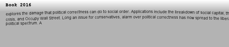 | 书目名称 | Political Correctness and the Destruction of Social Order | | 副标题 | Chronicling the Rise | | 编辑 | Howard S. Schwartz | | 视频video | http://file.papertrans.cn/751/750064/750064.mp4 | | 概述 | Examines political correctness through the lens of psychoanalytic theory with applications for sociology.Unique analysis of an under examined, but timely and important social phenomenon.Provides an un | | 图书封面 |  | | 描述 | This book develops a psychoanalytic theory of political correctness and the pristine self, which is defined as a self touched by nothing but love. It explores the damage that political correctness can do to social order. Applications include the breakdown of social capital, the financial crisis, and Occupy Wall Street. Long an issue for conservatives, alarm over political correctness has now spread to the liberal side of the political spectrum. As Schwartz argues, all have reason to be concerned. The psychology that underlies political correctness has the potential to be extremely destructive to social organization on every level. Schwartz discusses the primitive roots of political correctness and, through the use of case studies, shows its capacity for ruination. The book focuses on a transformation in the idea of the self, and specifically the rise of the pristine self. The problem is that, in truth, the world does not love us. This puts the pristine self at war with objective reality. | | 出版日期 | Book 2016 | | 关键词 | Social Psychology; Psychoanalysis; Political Correctness; Self; Self-consciousness; Oedipal Dynamics; Poli | | 版次 | 1 | | doi | https://doi.org/10.1007/978-3-319-39805-1 | | isbn_softcover | 978-3-319-81971-6 | | isbn_ebook | 978-3-319-39805-1 | | copyright | The Editor(s) (if applicable) and the Author(s) 2016 |