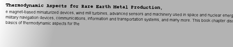 | 书目名称 | Rare-Earth Metal Recovery for Green Technologies | | 副标题 | Methods and Applicat | | 编辑 | Rajesh Kumar Jyothi | | 视频video | http://file.papertrans.cn/822/821280/821280.mp4 | | 概述 | Provides comprehensive coverage of the development, use, extraction, and recovery of rare earth metals.Describes the growing variety of applications of rare earth metals in modern technology.Examines | | 图书封面 |  | | 描述 | .This book examines the development, use, extraction, and recovery of rare earth metals. Rare earth elements (REEs) occupy a key role in daily life in industrial applications. They are one of the critical elements for energy and sustainable growth. REEs are utilized in many modern electrical and electronic devices such as smart phones, computers, LED lights etc. Recovery of the REEs from secondary resources represents a way to meet the growing demand for electronic devices. Because of their rarity, utility, and importance, the recovery, utilization and recycling of rare earth metals is of utmost importance. This book presents both current methods of processing rare earths from primary and secondary sources and new, green routes for their isolation and purification. The book also addresses their utilization, re-use, reduction, and recycling policies that exist globally. Applications in metallurgy, magnets, ceramics, electronics, and chemical, optical, and nuclear technologies are discussed.. | | 出版日期 | Book 2020 | | 关键词 | Rare Earth Recovery; Hydrometallurgy; Applied Chemistry; Green Chemistry; Resource Recycling; Electronic | | 版次 | 1 | | doi | https://doi.org/10.1007/978-3-030-38106-6 | | isbn_softcover | 978-3-030-38108-0 | | isbn_ebook | 978-3-030-38106-6 | | copyright | Springer Nature Switzerland AG 2020 |
