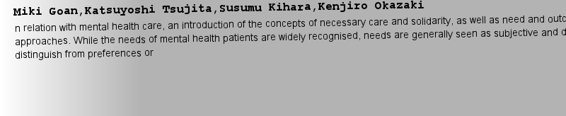 Tomoya Ishibashi,Hideo Iwasakin relation with mental health care, an introduction of the concepts of necessary care and solidarity, as well as need and outcome based approaches. While the needs of mental health patients are widely recognised, needs are generally seen as subjective and difficult to distinguish from preferences or