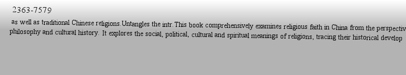 | 概述 | Provides an outlook of contemporary Chinese people’s religious faith.Explores the transmission and development of foreign religions in China as well as traditional Chinese religions.Untangles the intr |