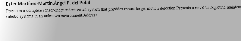 | 描述 | This work proposes a complete sensor-independent visual system that provides robust target motion detection. First, the way sensors obtain images, in terms of resolution distribution and pixel neighbourhood, is studied. This allows a spatial analysis of motion to be carried out. Then, a novel background maintenance approach for robust target motion detection is implemented. Two different situations are considered: a fixed camera observing a constant background where objects are moving; and a still camera observing objects in movement within a dynamic background. This distinction lies on developing a surveillance mechanism without the constraint of observing a scene free of foreground elements for several seconds when a reliable initial background model is obtained, as that situation cannot be guaranteed when a robotic system works in an unknown environment. Other problems are also addressed to successfully deal with changes in illumination, and the distinction between foreground and background elements. |