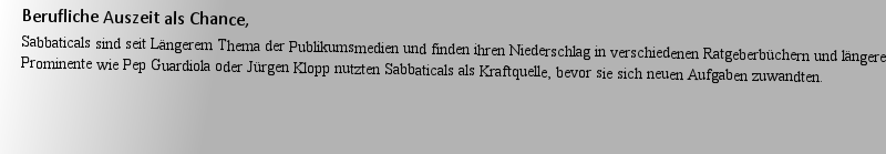 | 概述 | Strukturiert die Anlässe für Sabbaticals und zeigt Arbeitnehmern wie auch Personalabteilungen die Möglichkeiten für eine faire, karrierefördernde Gestaltung auf.Ein Handlungsleitfaden für Arbeitnehmer |