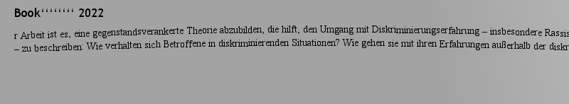 | 描述 | In diesem Open-Access-Buch wird eine qualitative Studie zum Thema Diskriminierungserfahrungen von Fachkräften der Sozialen Arbeit vorgestellt. Ziel der Arbeit ist es, eine gegenstandsverankerte Theorie abzubilden, die hilft, den Umgang mit Diskriminierungserfahrung – insbesondere Rassismuserfahrungen – zu beschreiben: Wie verhalten sich Betroffene in diskriminierenden Situationen? Wie gehen sie mit ihren Erfahrungen außerhalb der diskriminierten Situation um? Einer der Schwerpunkte der Untersuchung ist das Zusammenspiel der Erfahrungen und des professionellen Arbeitskontextes. Das Theoriemodell der Schützenden Bewältigung ist ein Beitrag zur rassismuskritischen Sozialen Arbeit und lädt zu einem Perspektivenwechsel ein. Die theoretischen Überlegungen bieten gleichzeitig Anknüpfungspunkte für die Praxis.. |