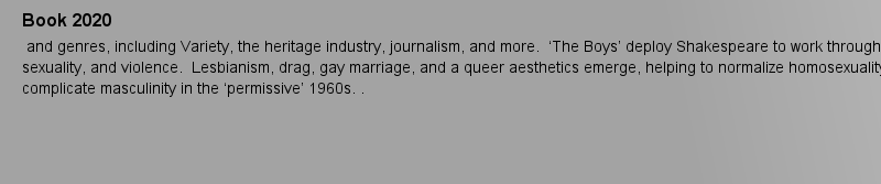 | 书目名称 | Shakespeare and Sexuality in the Comedy of Morecambe & Wise | | 编辑 | Stephen Hamrick | | 视频video | http://file.papertrans.cn/867/866196/866196.mp4 | | 概述 | Employs comic theory, rhetorical analysis, cognitive psychology and historical contextualization to recover the ways that Morecambe & Wise’s humor communicated with its original audiences.Situates Mor | | 丛书名称 | Palgrave Studies in Comedy | | 图书封面 |  | | 描述 | .Contextualizing the duo’s work within British comedy, Shakespeare criticism, the history of sexuality, and their own historical moment, this book offers the first sustained analysis of the 20th Century’s most successful double-act. Over the course of a forty-four-year career (1940-1984), Eric Morecambe & Ernie Wise appropriated snippets of verse, scenes, and other elements from seventeen of Shakespeare’s plays more than one-hundred-and-fifty times. Fashioning a kinder, more inclusive world, they deployed a vast array of elements connected to Shakespeare, his life, and institutions. Rejecting claims that they offer only nostalgic escapism, Hamrick analyses their work within contemporary contexts, including their engagement with many forms and genres, including Variety, the heritage industry, journalism, and more. ‘The Boys’ deploy Shakespeare to work through issues of class, sexuality, and violence. Lesbianism, drag, gay marriage, and a queer aesthetics emerge, helping to normalize homosexuality and complicate masculinity in the ‘permissive’ 1960s. . | | 出版日期 | Book 2020 | | 关键词 | Morecambe, Eric; Wise, Ernie; Morecambe & Wise; Shakespeare; Shakespop; Adaptation; gender and sexuality | | 版次 | 1 | | doi | https://doi.org/10.1007/978-3-030-33958-6 | | isbn_softcover | 978-3-030-33960-9 | | isbn_ebook | 978-3-030-33958-6Series ISSN 2731-4332 Series E-ISSN 2731-4340 | | issn_series | 2731-4332 | | copyright | The Editor(s) (if applicable) and The Author(s), under exclusive license to Springer Nature Switzerl |