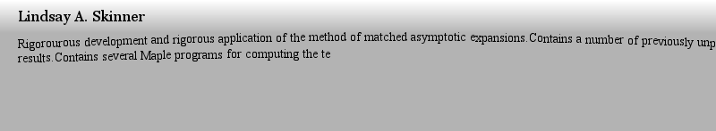 | 概述 | Rigorourous development and rigorous application of the method of matched asymptotic expansions.Contains a number of previously unpublished results.Contains several Maple programs for computing the te |