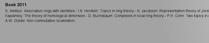 | 描述 | S. Amitsur: Associative rings with identities.- I.N. Herstein: Topics in ring theory.- N. Jacobson: Representation theory of Jordan algebras.- I. Kaplansky: The theory of homological dimension.- D. Buchsbaum: Complexes in local ring theory.- P.H. Cohn: Two topics in ring theory.- A.W. Goldie: Non-commutative localisation. |